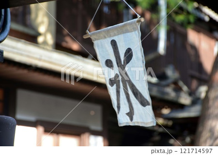 簾にかかった氷旗とカップに入ったいろんな味のかき氷