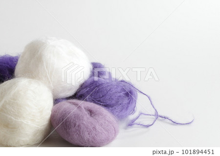 モヘアの白と紫(パープル)の毛糸玉 クローズアップのイメージ