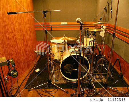 スタジオのドラムセットと録音用マイク