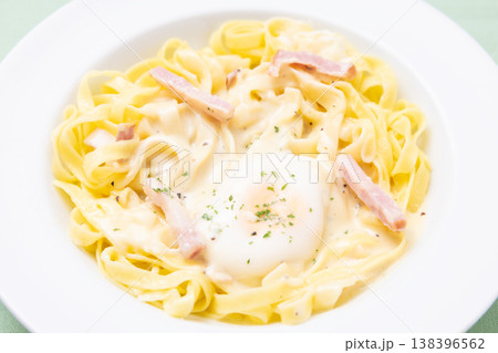 真上から見たテーブル背景のタリアテッレのカルボナーラ