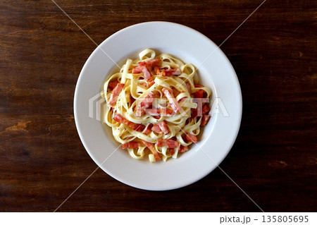 真上から見たタリアテッレのベーコンたっぷりのカルボナーラ