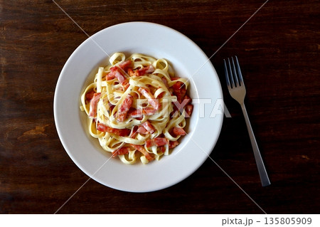 クリーミーなカルボナーラ タリアテッレ シンプルなパスタ 明るい背景