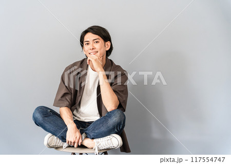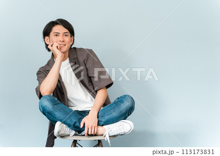 椅子に座るスニーカーとジーンズ姿のさわやかな男性