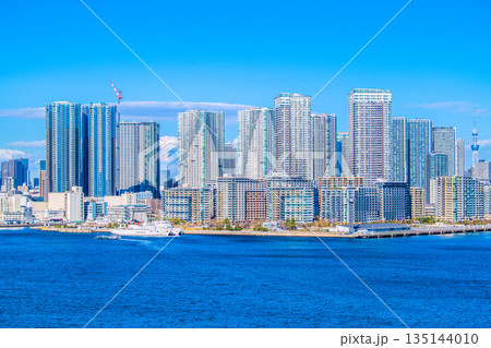 日本の東京都市景観 晴海や照洋丸、豊海地区のタワーマンションなどを望む。左奥に日本橋再開発