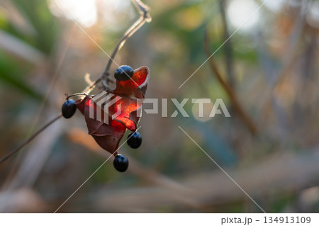 秋の森景色 赤く色付いたタンキリマメ