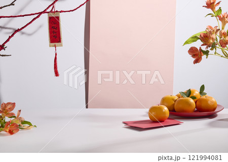 A Chinese New Year display includes a pink panel on a white backdrop, tangerines and alstroemeria flowers on fortunate envelopes, a red branch hanging calligraphists, and an empty products display.