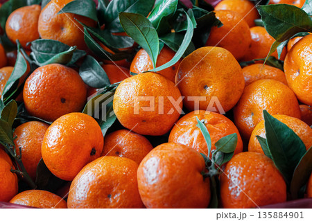 Close-up of fresh tangerines with green leaves, healthy eating concept, bright citrus fruits, natural products, fresh fruits, healthy food, seasonal harvest, fruit market concept