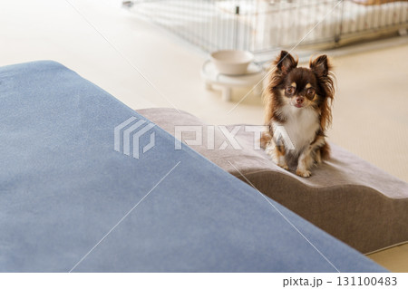 ソファーの前のペット用のスロープと犬