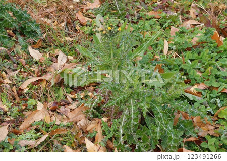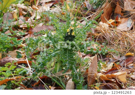 鬼とついていても可愛らしい黄色い小さな花を沢山つけるオニタビラコ