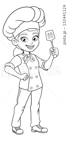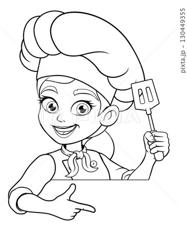 Cartoon Chef Woman Holding Spatula Pointing Sign