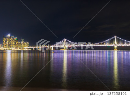 釜山 ライトアップされた広安大橋とザ・ベイ101の高層ビル