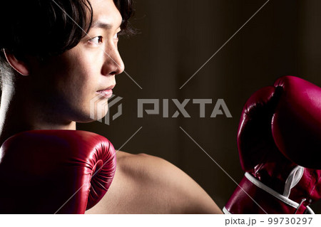 ボクシンググローブをつけてファイティングポーズをとる若い男性
