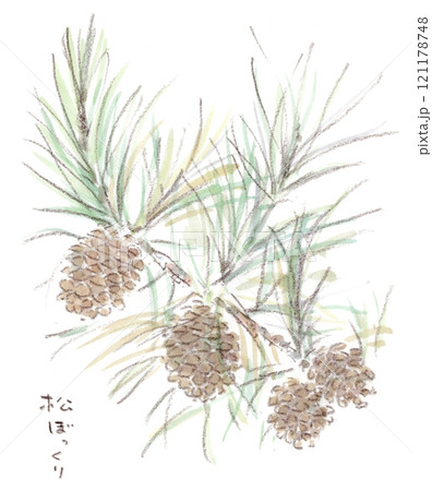 秋の植物、立派な松ぼっくりを枝に付けたダイオウショウ(大王松)の水彩画イラスト