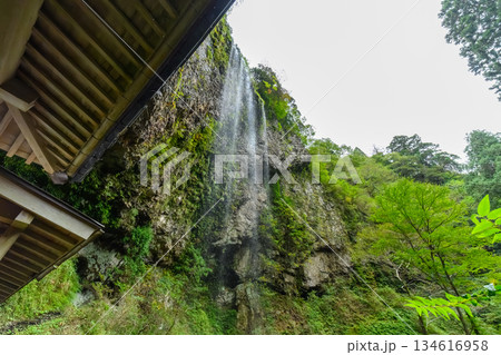 秋色の森に流れ落ちるキャメロン滝 イエローナイフ近郊の自然風景