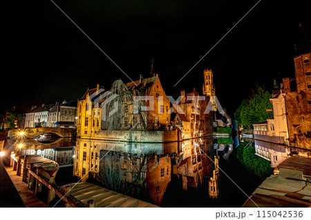 ベルギー ブルッヘ 夜のダイフェル運河と鐘楼