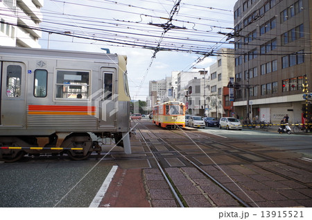 松山の路面電車 平面交差をする路面電車と郊外電車 伊予鉄道 大手町駅 松山市 愛媛県