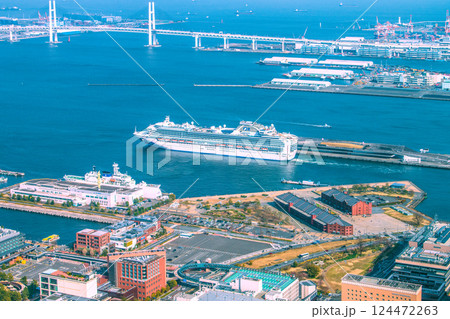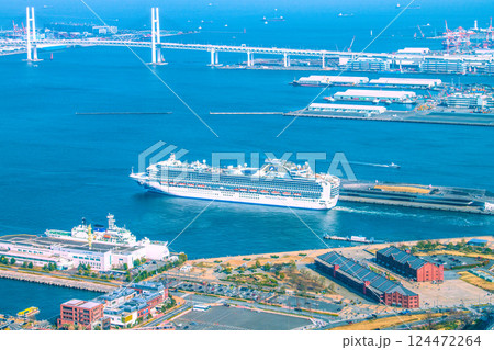 日本の横浜都市景観 出港するダイヤモンド・プリンセスなどを望む。(オイローパ2が初入港)