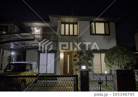 小さな庭のある一戸建ての住宅 夜景 perming 写真素材