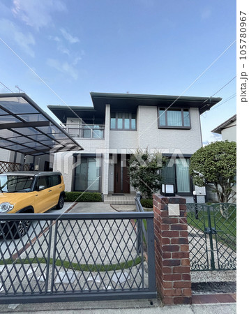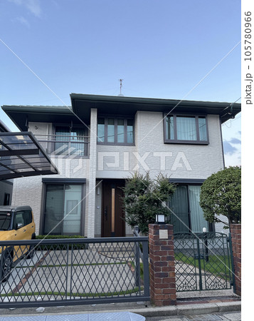 閑静な住宅街に建つ小さな庭とカーポートのある一戸建ての住宅 perming 写真素材