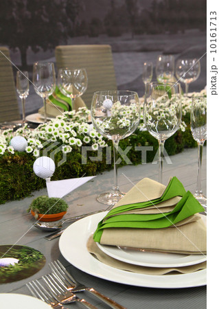 Beautiful table setting for a party, wedding reception or other festive event. Banquet setting, glasses, plates.