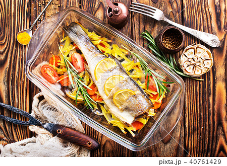 Roasted pike perch or cod fish with baked vegetables. Dish decorated with a slice of lemon