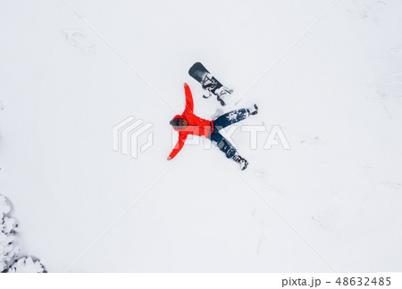 Aerial view of a man lying in the snow