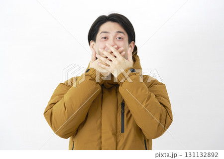 ダウンジャケットを着た男性 驚く 白背景