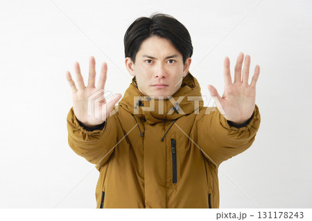 ダウンジャケットを着た男性 制止のポーズ 白背景
