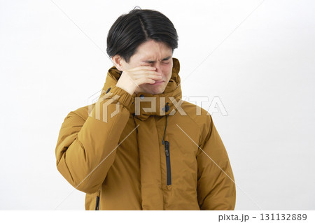 ダウンジャケットを着た男性 鼻づまり 白背景