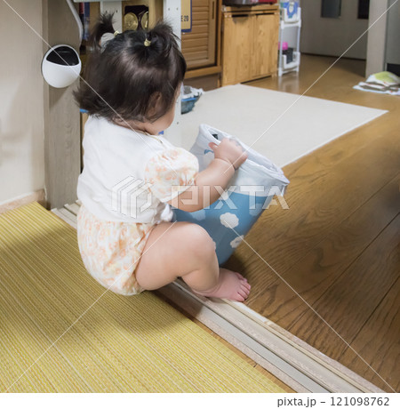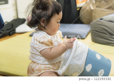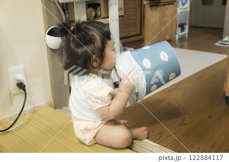 【ゴミ箱をいたずらするツインテールの赤ちゃん】