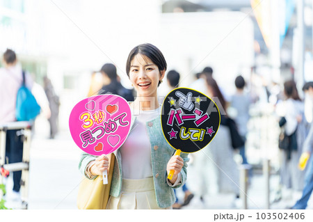 応援うちわを持ってライブ会場の前に立つ女性 推し活