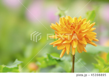 ひっそりと咲くちょうど見ごろの満開の黄色いダリア