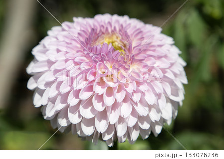 ひっそりと咲くちょうど見ごろの満開の淡いピンクと紫色のダリア