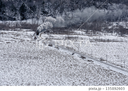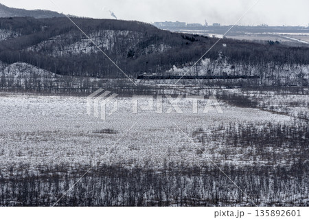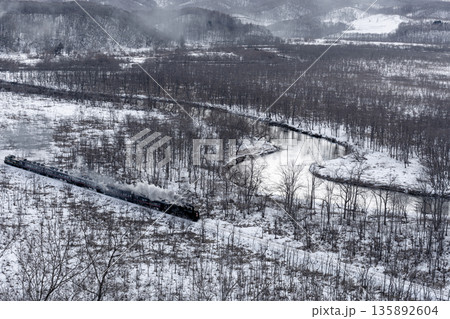 雪の積もった釧路湿原を走るSL冬の湿原号