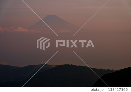 伊豆半島の伊豆山稜線歩道 達磨山の登山道より望む朝焼けの富士山と小達磨山