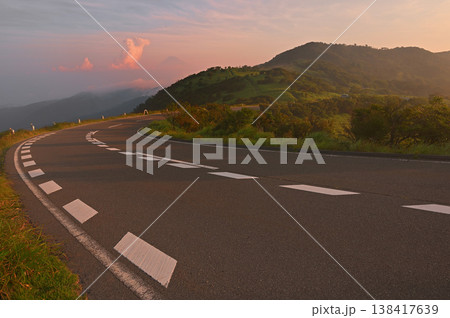 伊豆半島の伊豆山稜線歩道 西伊豆スカイラインから望む朝焼けの富士山と小達磨山
