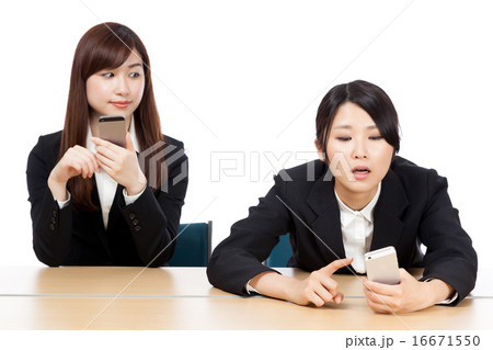 ビジネスウーマン 2ショット スマートフォン 操作 ダレる