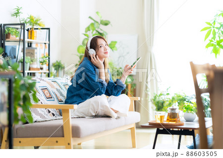 女性 ヘッドフォン スマホ 音楽鑑賞 リビング ライフスタイル ニューノーマル