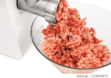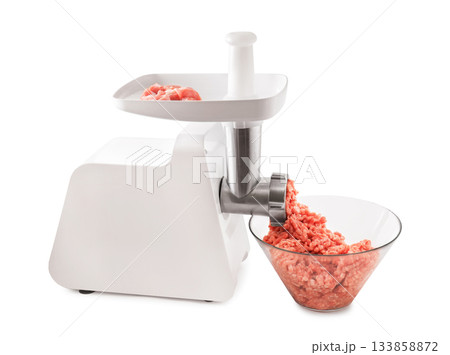A white electric meat grinder with raw meat pieces on the tray, actively mincing meat into a clear glass bowl, isolated on white. High quality photo