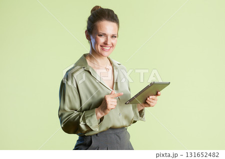 Aged woman holding and showing tablet screen with toothy smiling and satisfied face. Grandmother in light blue suit with collected gray hair bun hairstyle. Studio shot, isolated on gray background