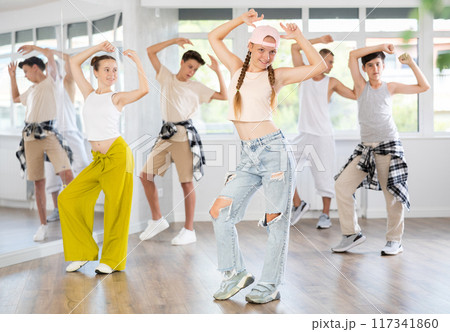 Group of teenagers in stylish clothes are training to dance low break and hip-hop in studio