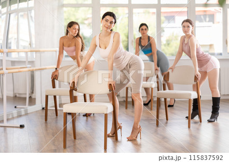 Cheerful young woman and multinational women training synchronous group choreography during dancing around chair and practicing strip plastic moves in dance studio