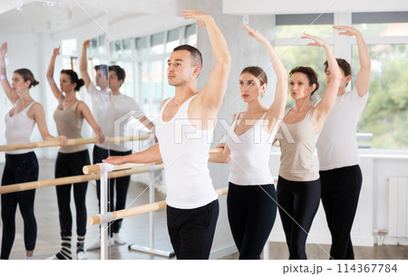 Experienced young male ballet dancer, dressed in white and black and group of girls and guys engaged in classical ballet performs exercise standing in 3rd position near ballet barre in dance hall
