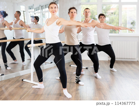 Positive girl with women and men engaged in group class perform exercise near ballet barre, standing in first position of ballet stance in dance studio