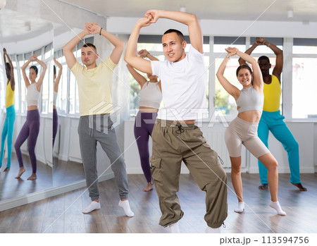 European guy with team of like-minded multinational people learn to elements of hip hop dance