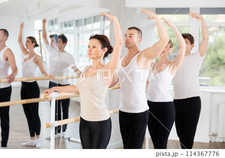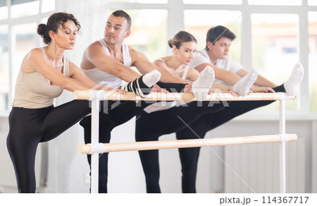 Dedicated young females and males ballet dancer performing leg stretch at barre with concentration and grace in choreography studio during group rehearsal