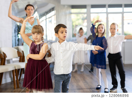 Preteen children in elegant outfits practicing partner dance in Christmas studio