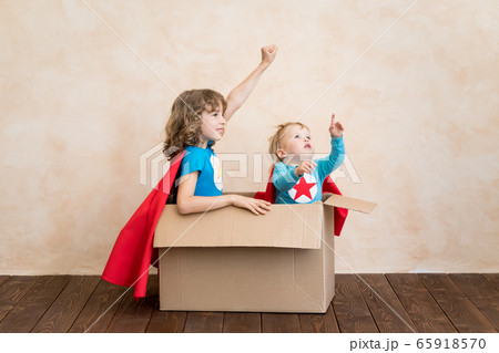 Superheroes children playing in cardboard box