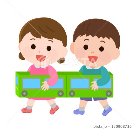 ダンボールの電車ごっこで遊ぶ男の子と女の子 イラスト
