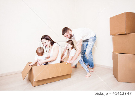 引っ越し作業中の家族3人